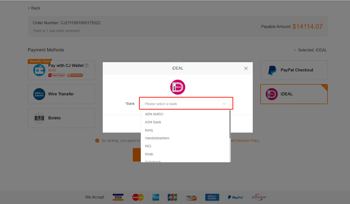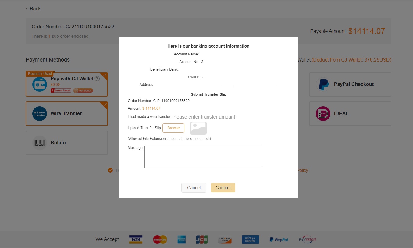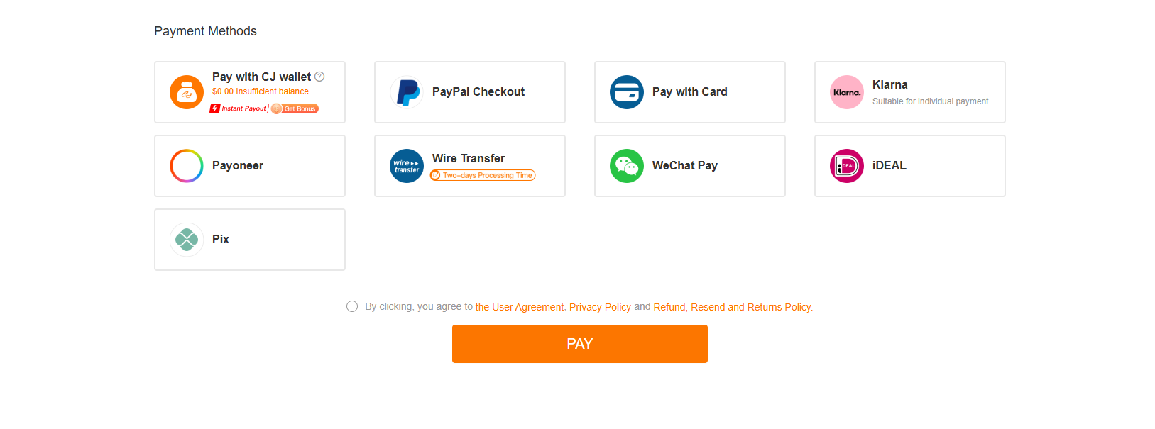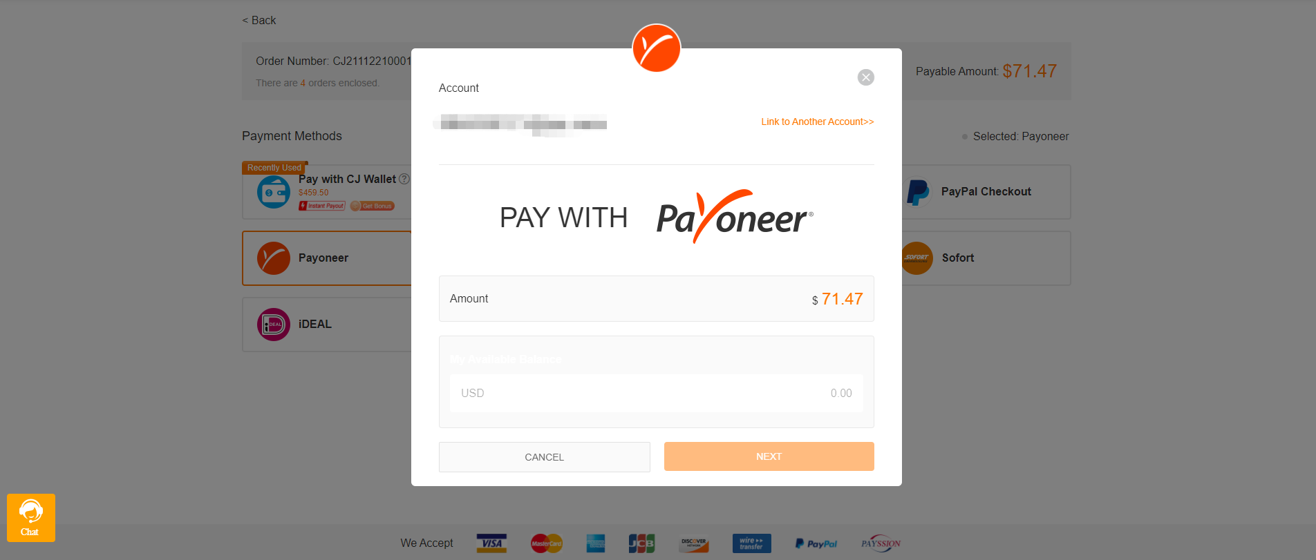 It's the most recommended payment method in CJ. You can link your Payoneer to CJ so that you don't need to log in for each payment. While making the payment, it will show your account balance, and please make sure the balance is more than the order amount.