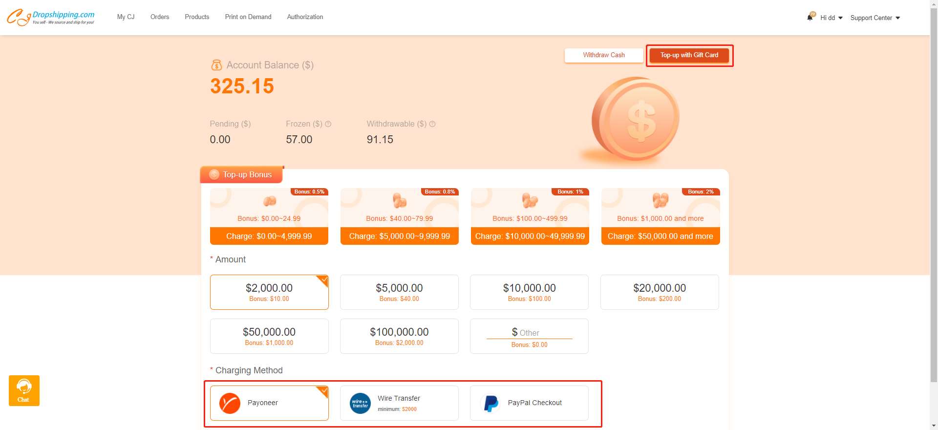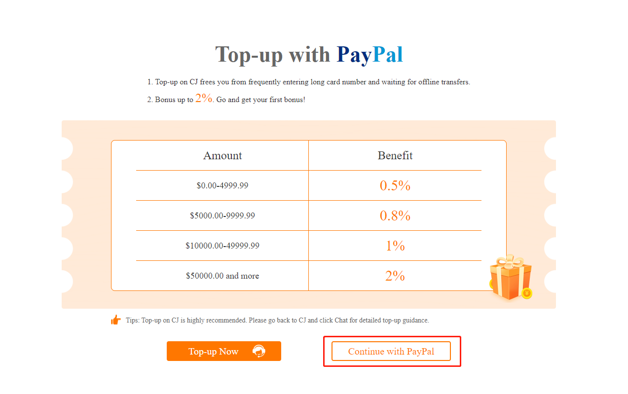CJ Wallet is the amount in your CJ account. You can top up the wallet with Payoneer, Wire Transfer and gift card, and we would provide up to a 2% bonus for your deposit.