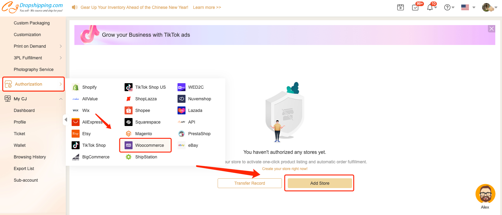 Go to Authorization > WooCommerce, and then, click Add Store.