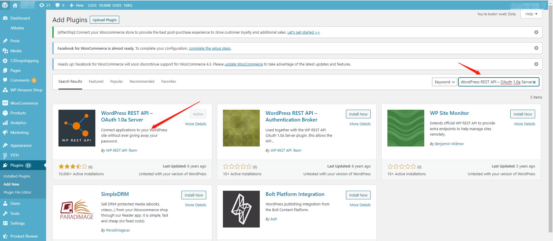 b. Install "WordPress REST API – OAuth 1.0a Server" from your WooCommerce Admin> Plugins> Add New> Add Plugins and activate it.