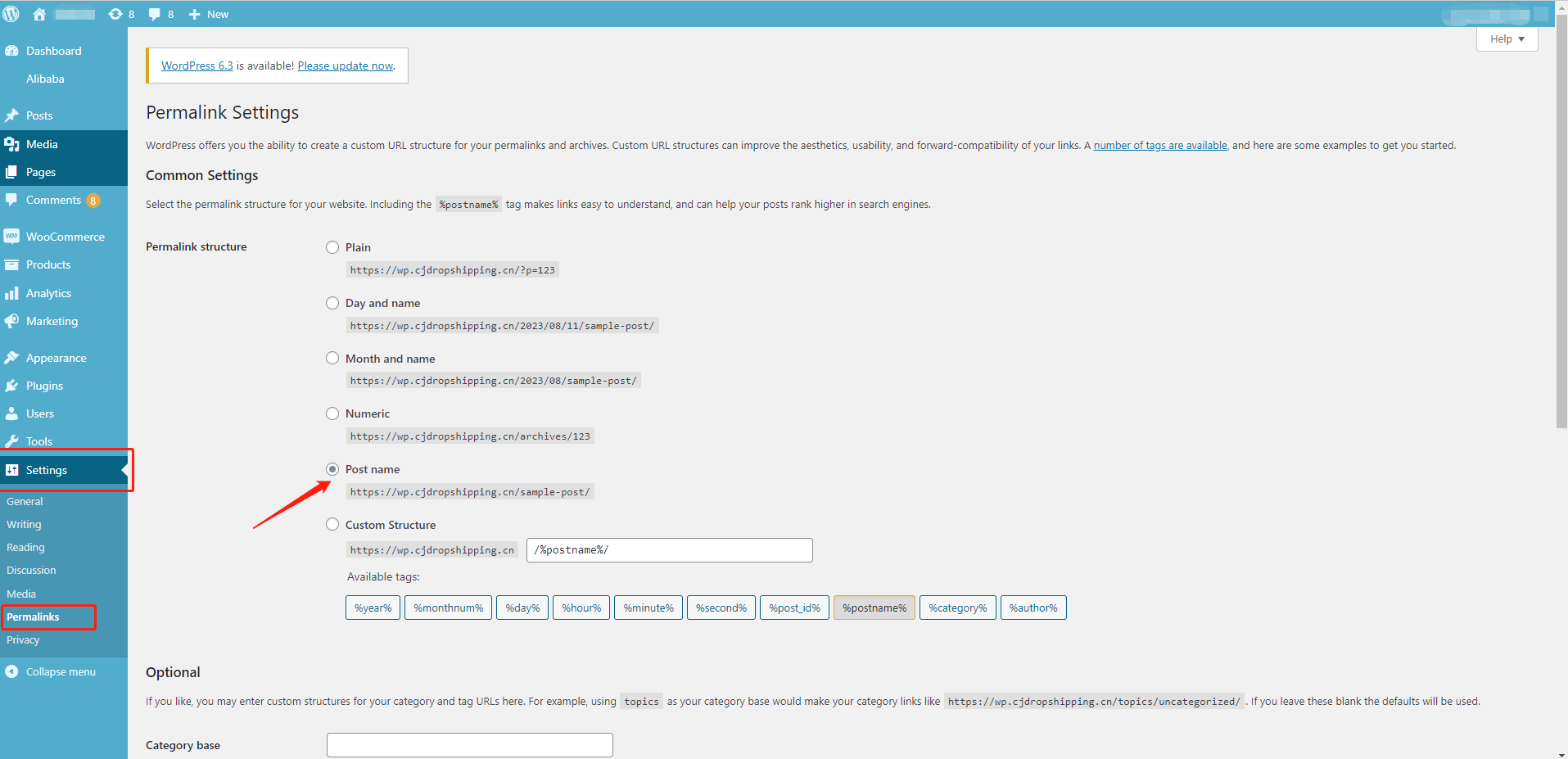 c. Choose the correct option "Post name" for Permalink structure from your WooCommerce Admin> Settings> Permalinks> Permalink structure.